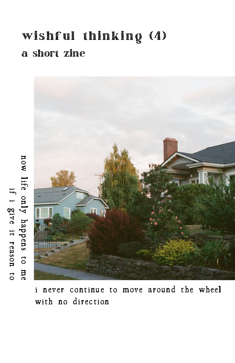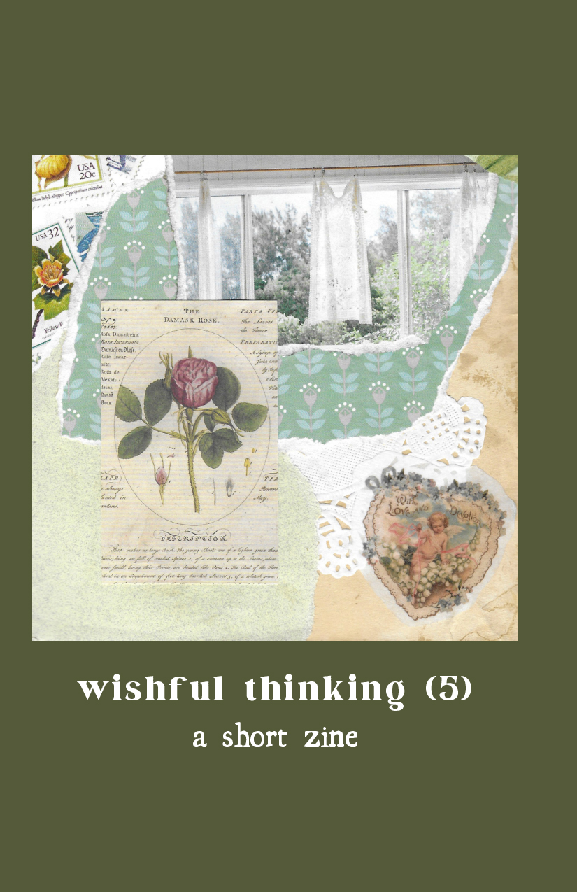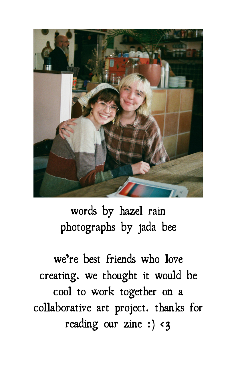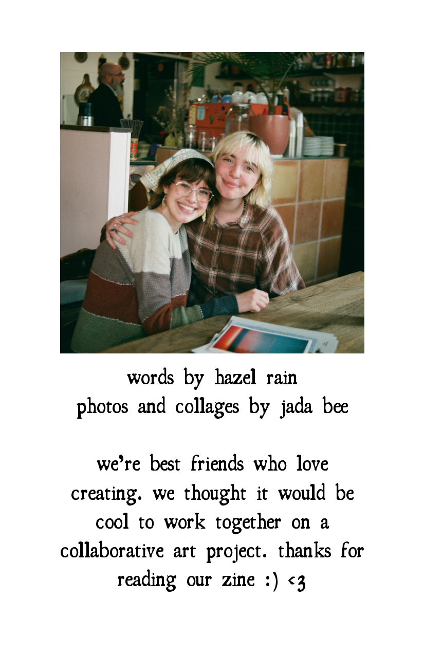 wishful thinking is an ongoing mini zine series by jada bee and hazel rain. this project began as a spontaneous decision to create something new out of archived work, giving new meaning to past photographs, collages, and writing. the artists connect their work together based on unifying themes, such as identity, searching for meaning, and change. the series is a way to make art imperfectly, and it feels important that they are accessible. to support this purpose, jada and hazel will always give these zines away for free.